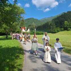 Bei wunderschönem Wetter wurde gemeinsam am 20.06.2019 um 08:00 Uhr das Fronleichnamsfest in der Pfarrkirche Palfau gefeiert. Die Messe wurde von der Musikkapelle Palfau feierlich umrahmt. Gestartet wurde mit einer gemeinsamen Festmesse in der Pfarrkirche, wo sich auch der 1. Altar befand. Angeführt vom Kreuzträger, der Musikkapelle, den Statuenträgern, viele Fahnenträgern, Pater Engelbert, den Ministranten, Laternen- und Himmelträgern zog die Prozession zum 2. Altar, der sich bei der Rinntaverne (Fam. Pechhacker) befand. Der 3. Altar war beim Holzknechtkreuz und der 4. Altar beim Kriegerdenkmal. Ein herzliches Dankeschön gilt Pater Engelbert für die feierliche Prozession und der Musikkapelle für die feierliche Umrahmung. Vielen Dank an ca. 20 Kinder aus Palfau, die mit Fahnen und Statuen das Fronleichnamsfest sehr bereichert haben. Danke an alle die beim Kirchenschmücken, beim Herrichten der wunderschön geschmückten Altäre mitgeholfen haben und an alle Mitwirkenden.